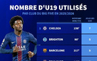 • 本赛季五大联赛U19球员切尔西使用人数最多,巴黎出场时间最多